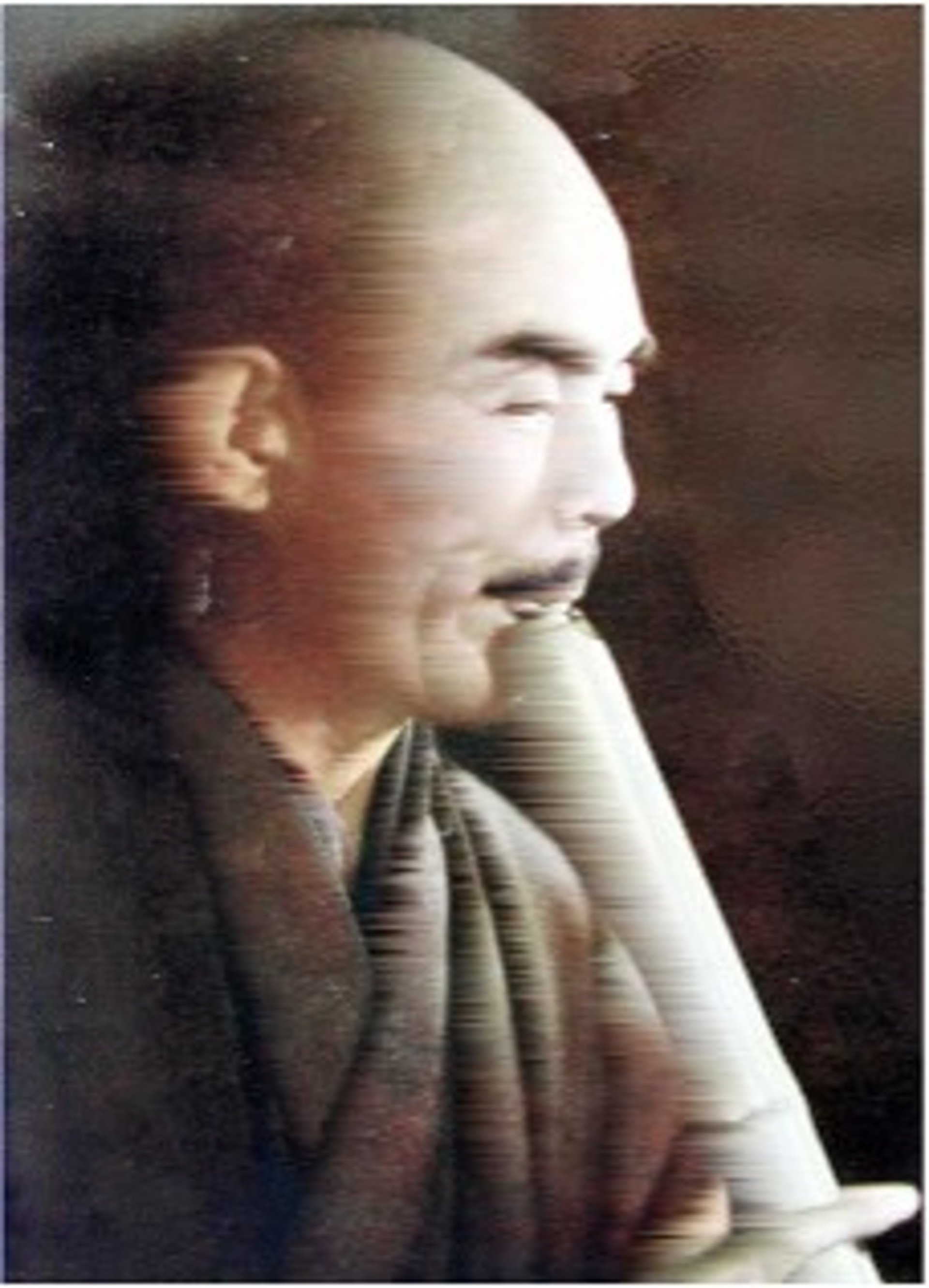 The next morning I awoke to the sound of an old man’s voice. I rose to see Yamamoto-San talking to a man outside. I went to the window to see who it was and noticed it had snowed lightly during the night. As the two men walked I caught a glimpse of the stranger. He had long grey hair and chiseled features. I knew this face, I thought. As Yamamoto came back into the cottage I asked with whom he had spoken? He smiled and told me, “Kozan-San the old man.” “He heard you play last night at dusk and stopped by to ask about you. “What’, I yelped… “he didn’t want to meet me?